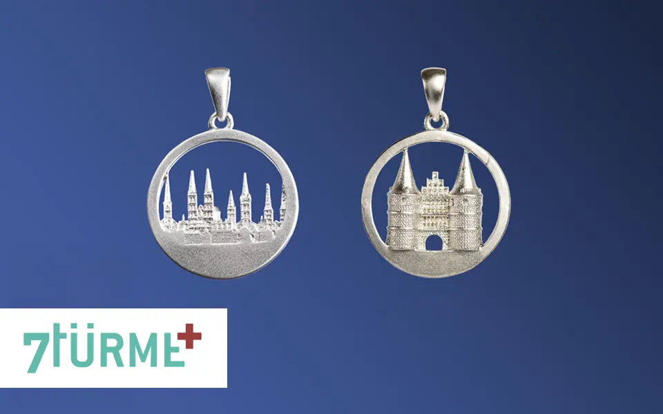 Der „Sieben Türme Anhänger“ und der „Holstentor Anhänger“ sind besondere Stücke: High-Tech trifft auf traditionelle Goldschmiedekunst.